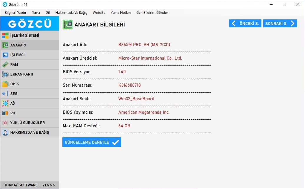 - Anakart bölümüne "Max. RAM Desteği" adında bir bölüm eklendi. Bu bölüm anakartınızın en fazla desteklediği RAM miktarını göstermektedir.