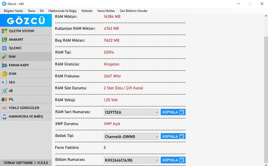 - RAM bölümüne "Bellek Numarası" eklendi. Bu alan belleğinizin ismini kısaltılmış halde, hızını, CL değerini ve kaç GB olduğunu gösterir.