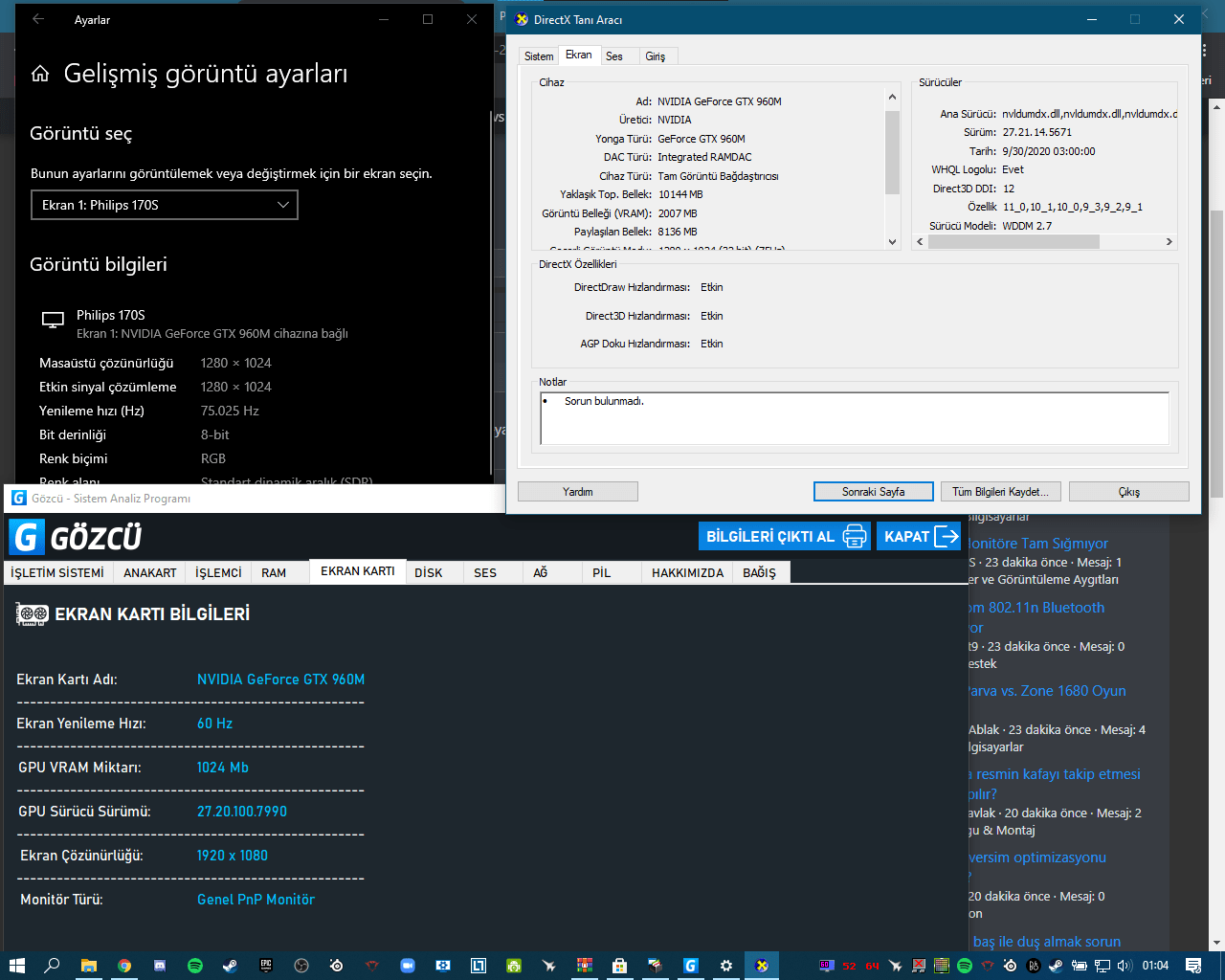 HDMI to VGA dönüştürücü kullanıyorum, görüntü ayarlarında maksimum yapabildiğim çözünürlük 1920X1080 60Hz fakat monitör 1280X1024 75Hz olduğu için 1280X1024 75Hz kullanıyorum fakat program 1920X1080 60Hz gösteriyor. Ayrıca ekran kartımın VRAM'i 2 GB olmasına rağmen 1GB gözüküyor: