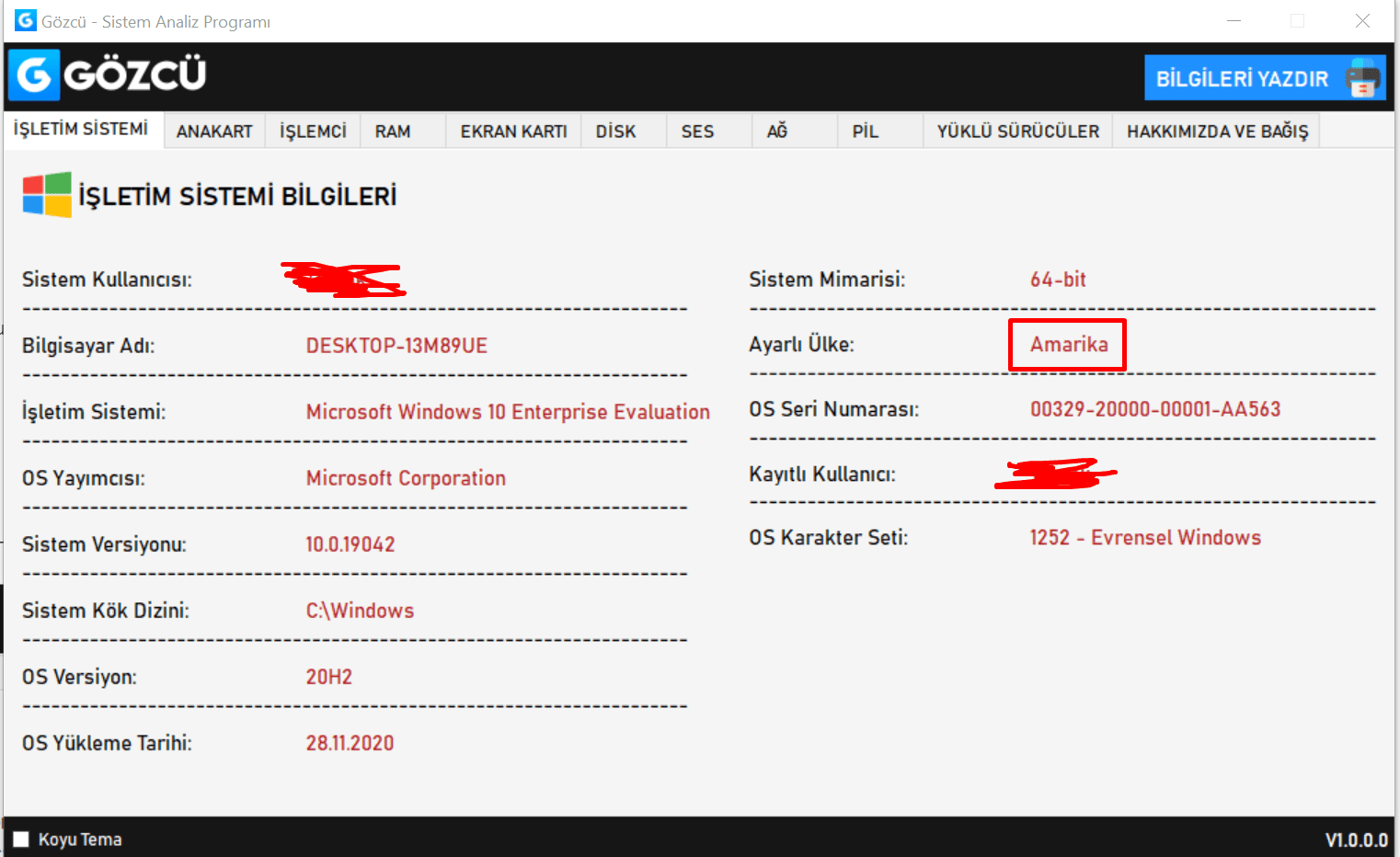 Ayarlı ülke kısmında bir harf hatası olmuş. Onun dışında BIOS sürümü gibi şeyleri doğru veriyor. AIDA64'e rakip olabilecek düzeye gelir umarım.