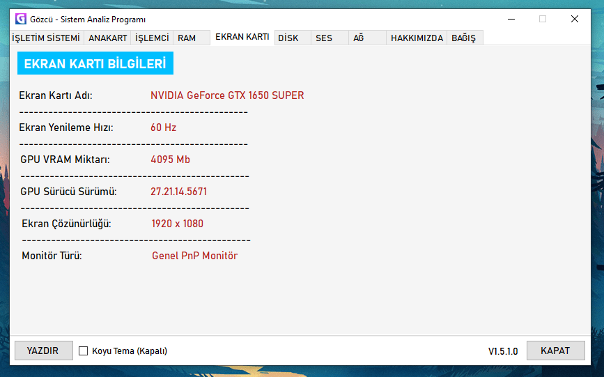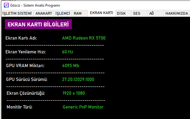 Ekran yenileme hızını doğru göstermiyor normalde 75 Hz. Bir de disk kısmında Windows'un olduğu diski gösteriyor yanlış anlamadıysam. Diğer diskler de gösterilebilir.
