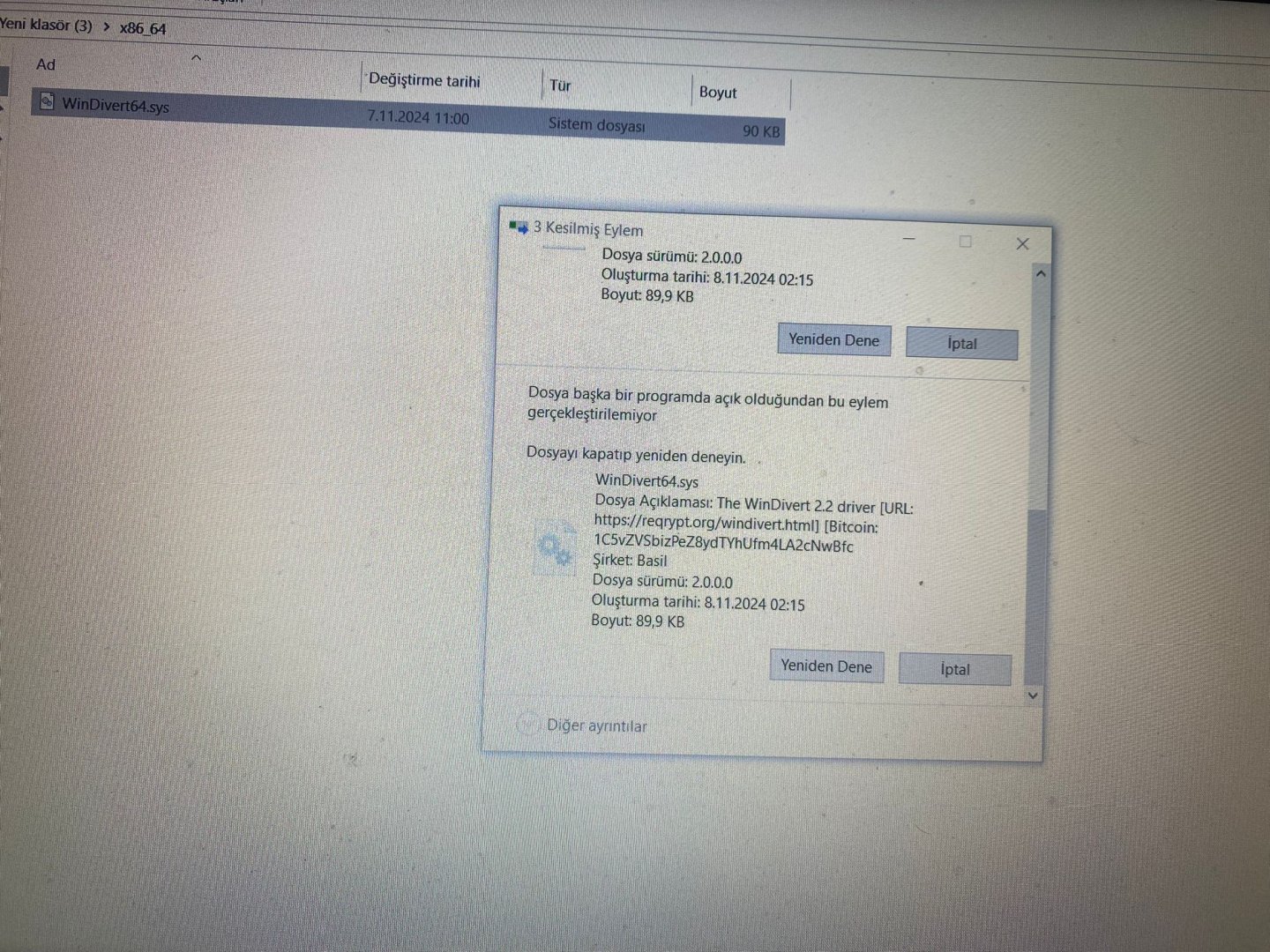 Silmeye çalıştığınızda aldığınız hatadaki Bitcoin adresi ise WinDivert geliştiricisinin Bitcoin Cüzdanı. WinDivert ücretsiz geliştirildiği için geliştirici yalnızca bağışlar ile ekonomik gelir elde edebiliyor.