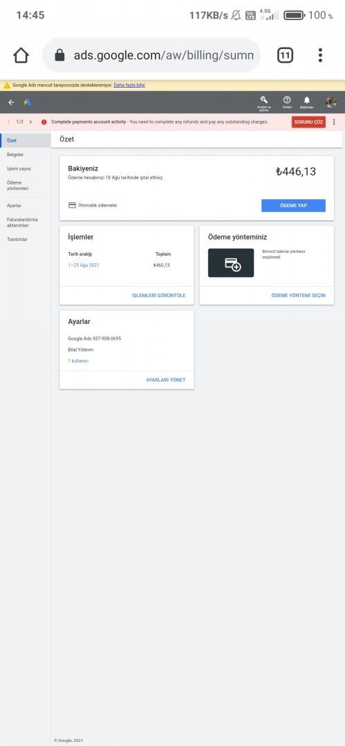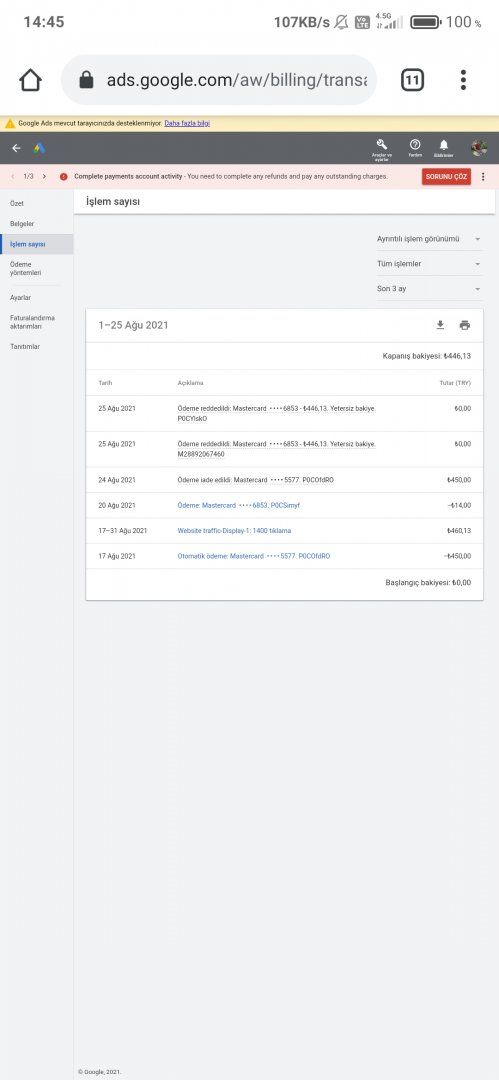 Merhabalar yaklaşık bir ay önce Google ads hesabıma Ukrayna'dan bir kişi nasıl becerdiyse reklam vermiş 450TL direkt karttan çekildi ben hesabı iptal ettim verilen reklamı da iptal ettim ama bugün hesaba girince 450TL daha ödeme gelmiş görünüyor hiçbir reklam falan yok Allah rızası için bilenler yardım etsin, kafayı yemek üzereyim. Ne yapmam lazım?