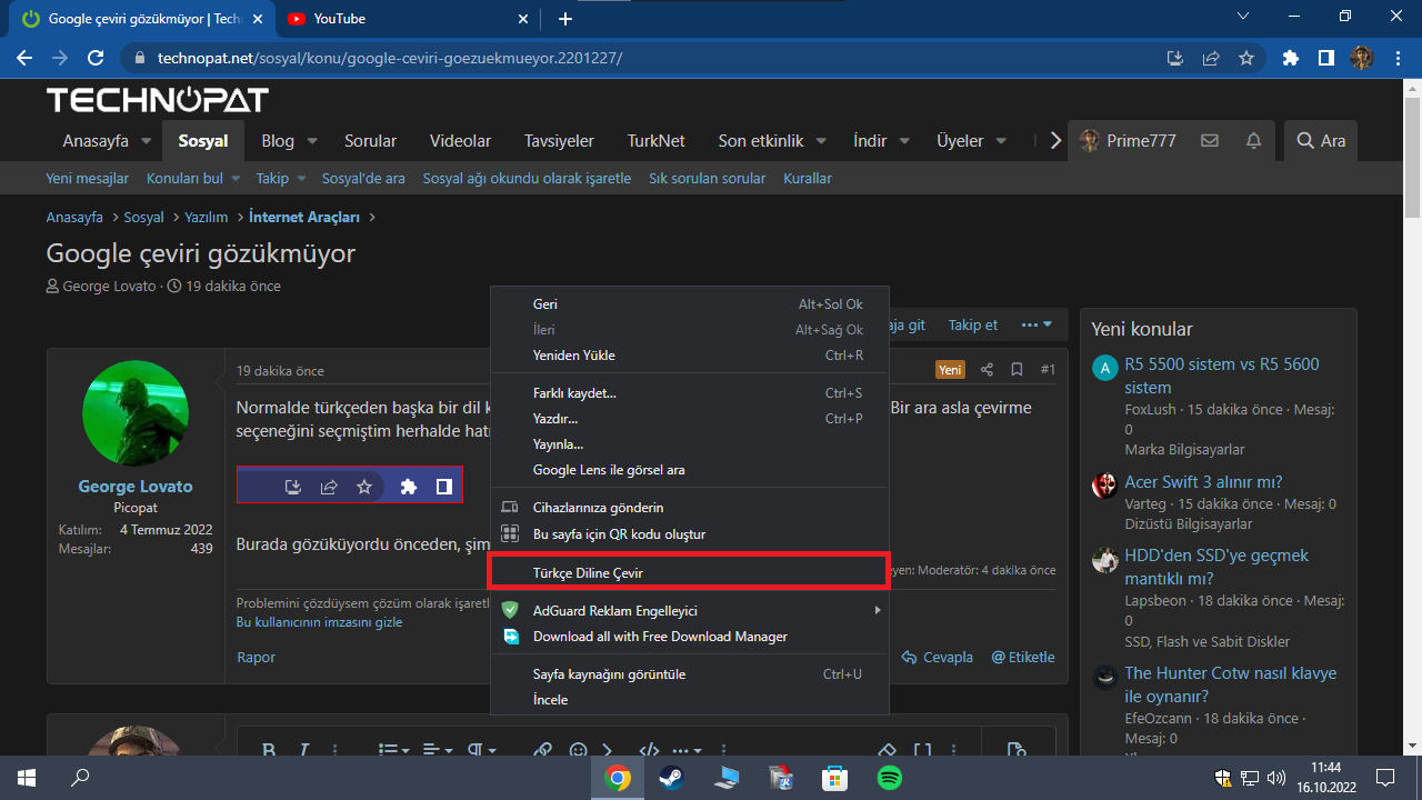 Normalde türkçeden başka bir dil kullanan sitelerde gözüken kutucuk şu an gözükmüyor. Bir ara asla çevirme seçeneğini seçmiştim herhalde hatırlamıyorum.
