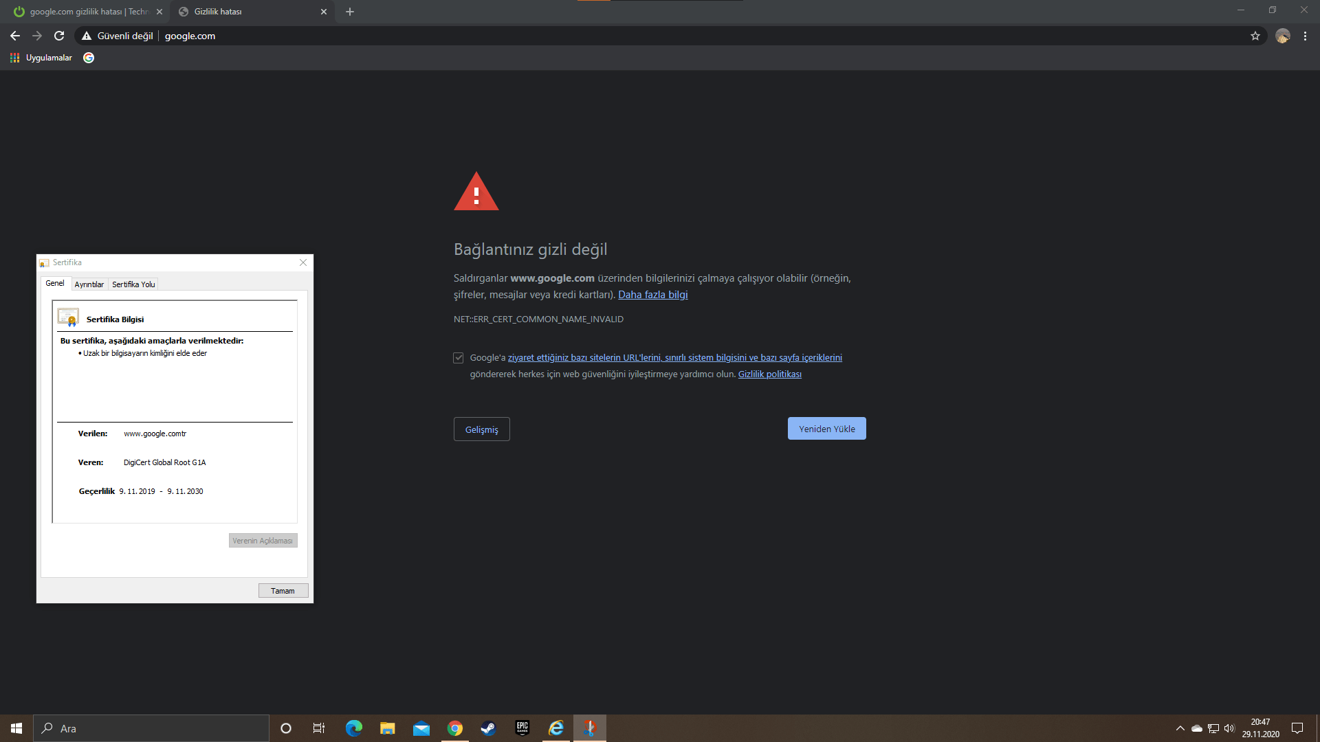 Hata bu şekilde. Şimdilik google.com.tr ile giriş yapıyorum. Her şeyi kontrol ettim ama sertifika eksik olabileceğini düşünüyorum ve hiçbir yerde bulamadım.