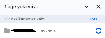 Selamlar, Google Drive hesabıma bir klasör yüklüyordum fakat 892ye kadar gelip orada takıldı ve neredeyse yarım saattir böyle, internetim iyi ve Drive'da yeterince bos alan var. Çözümü bilen varsa yardımcı olabilir mi?