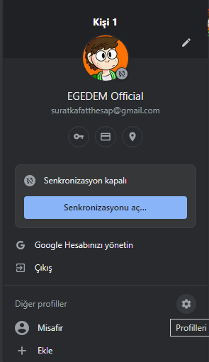 Diğer profiller tarafındaki dişliye tıkla, ardından kişi 1'i bul ve 3 noktaya basarak o profili sil.
