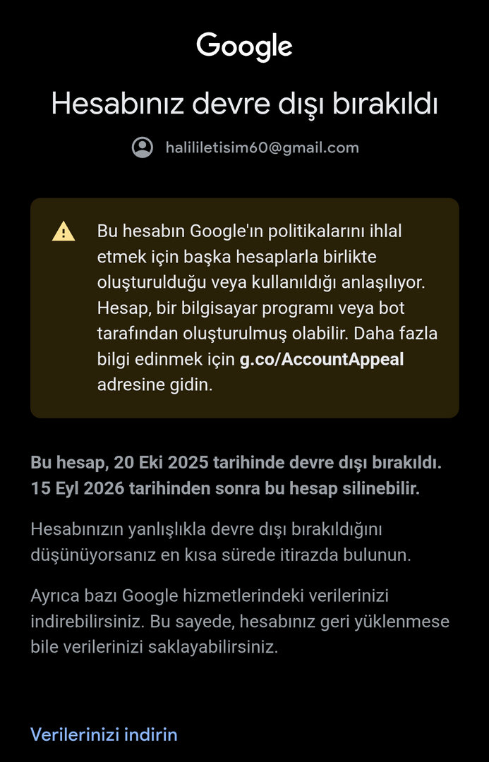 Arkadaşlar Google hesabım sebepsiz yere devre dışı bırakıldı, 100'den fazla yere bağlı ve içinde 20 adet şifrem kayıtlı. Hesabı geri alamazsam verilerim tümüyle gidiyor, neden olduğunu da hiç anlamıyorum. Google'da birden fazla hesap kullanmadım ya da kendime ait olmayan bir hesabı kendi e-postama aktarmadım. İçindeki her şey tamamı ile bana ait. Sebebi ne olabilir?