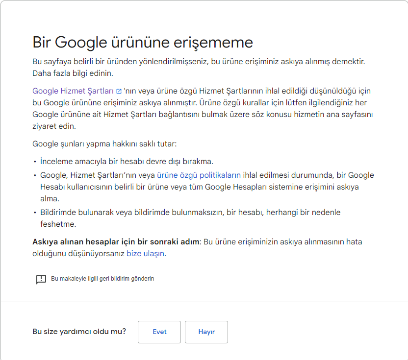 Yeri burası mi bilmiyorum ama en yakını buydu. Google hesabımı YouTube üzerinden engellemiş. Sebebi ne olabilir?