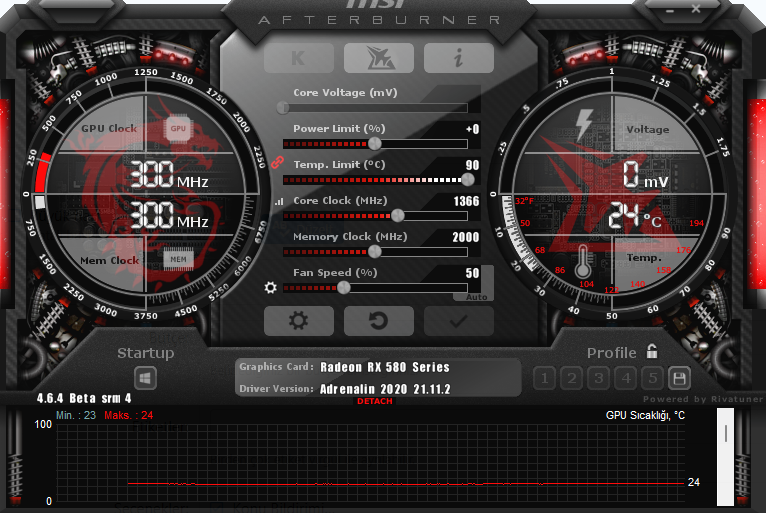 Afterburner'daki ayarlarım böyle. Memory clock ve GPU clock neden 300? Kaç olmalı ve nasıl ayarlarım?