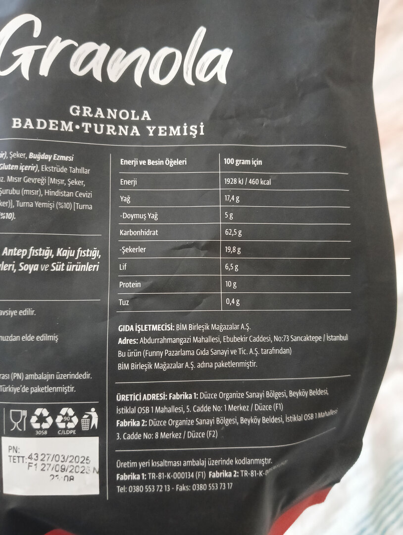 İçindekiler kısmında yazan maddeler en çoktan en aza doğru sıralanır. Granolalara bakın ilk sıralarda şeker görürsünüz. Demek ki içinde hayli şeker bulunuyor.