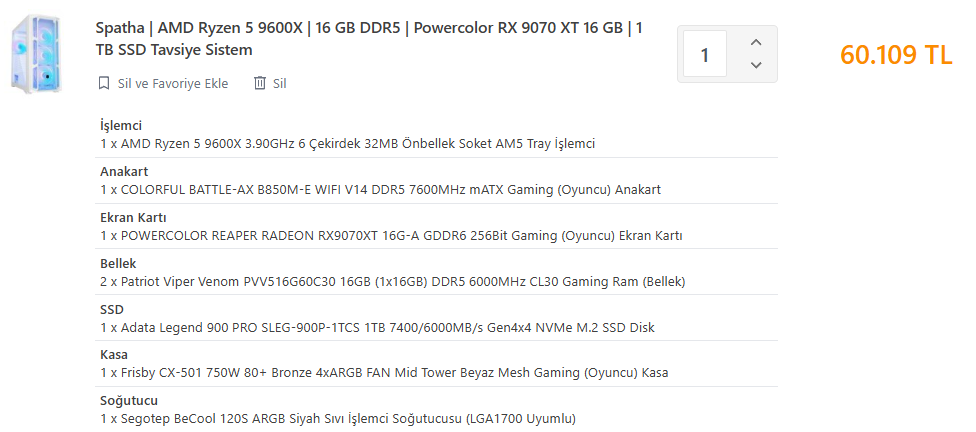 Hocam bu paralara çıkmışken toplamak daha mantıklı olacaktır. 7800x3D ve 9070 XT zaten ortalama bir 49k ediyor. Diğer kalan 10K'ya da anakart RAM kasa PSU SSD falan alırsın. İşlemcisi daha iyi oluyor dediğim gibi yaparsanız.