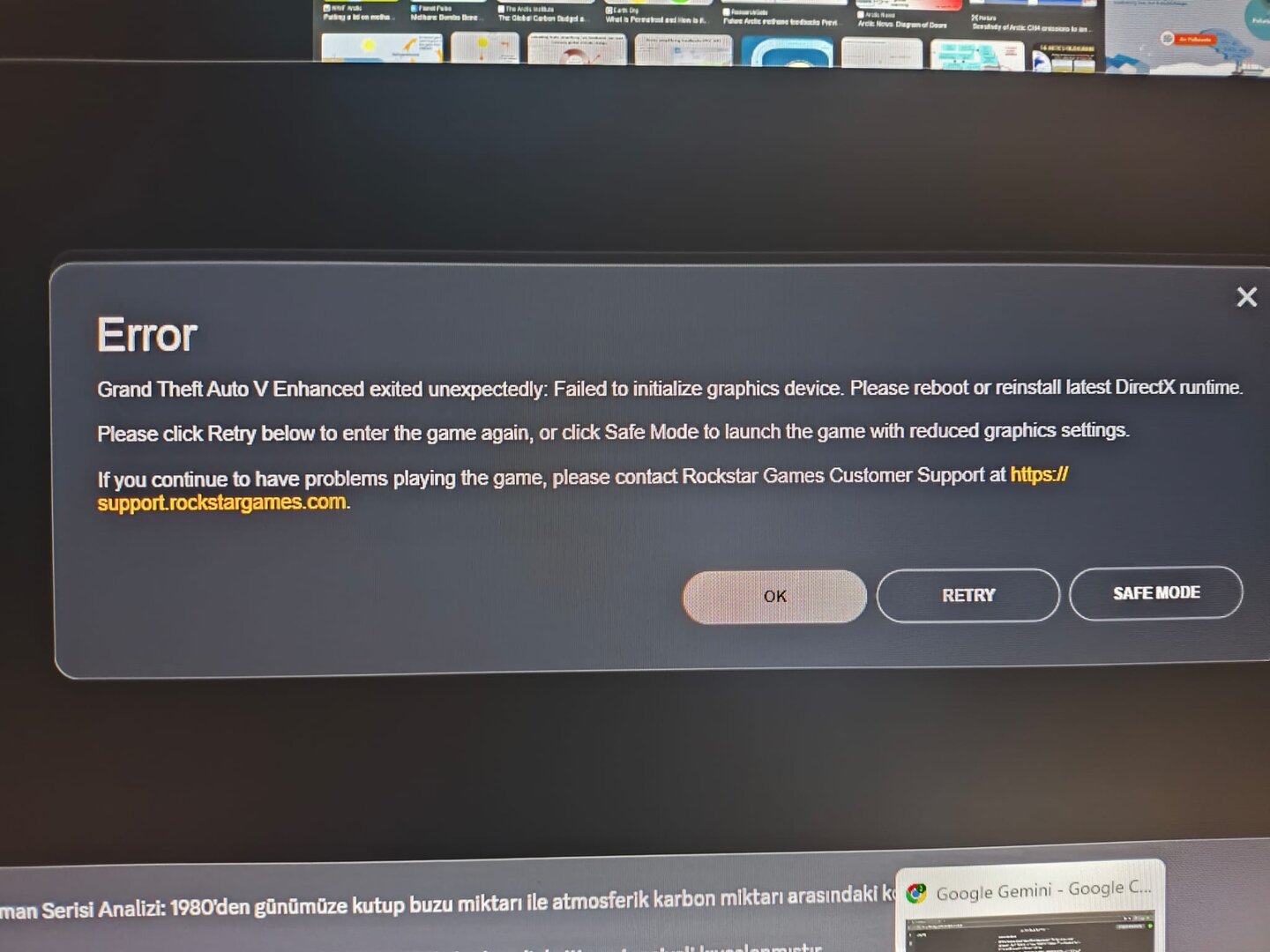 GTA 5 Enhanced oyununu başlattığımda ERR_GFX_INIT hatası ile şu yazıyı gösteriyor: failed to initialize Graphics device. Please reboot or reinstall latest DirectX runtime.