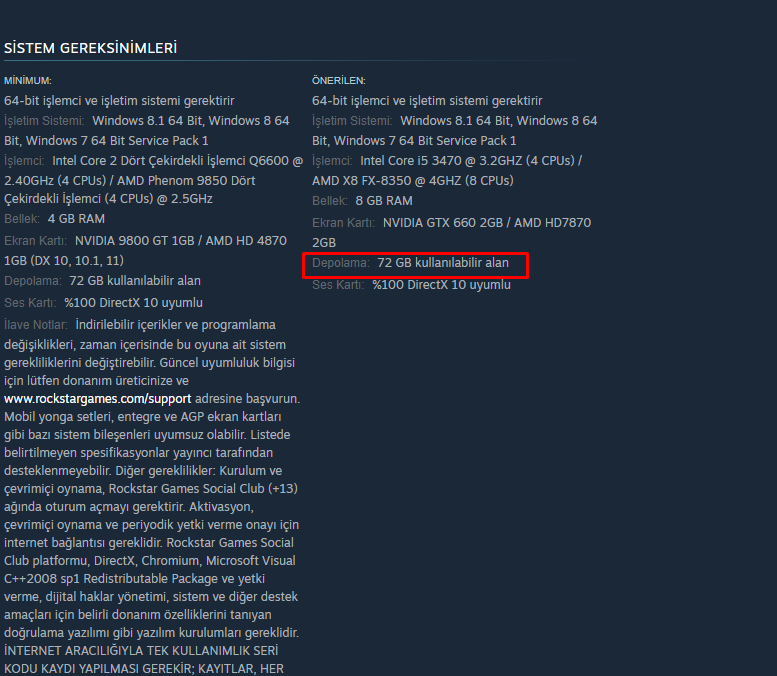Merhaba, benim depolamam 125 GB. Epic Games Launcher'da GTA 5 107 GB Steam'de kaç GB alan kaplıyor? Ona göre Steam'de oyunu alacağım.