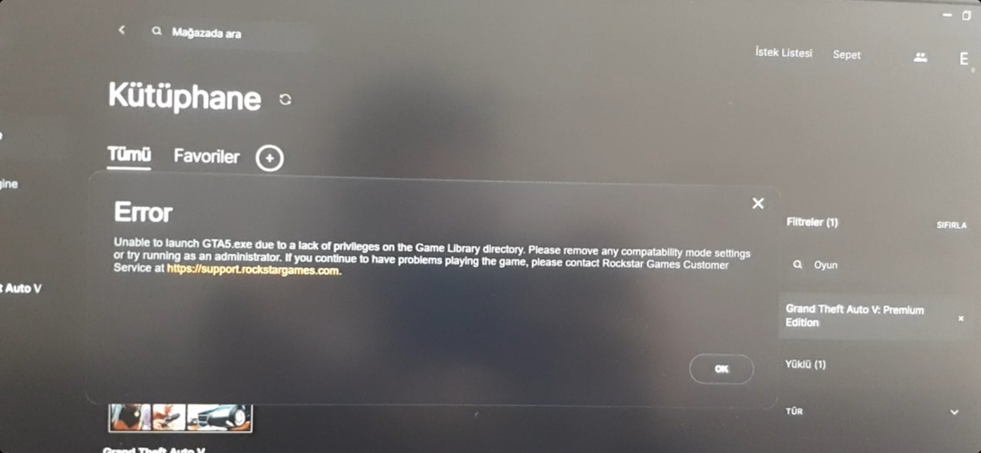 GTA 5'im var. Epic Games'ten mod yapıldı hata verdiği için sildim geri yükledim yine aynı hatayı verdi.