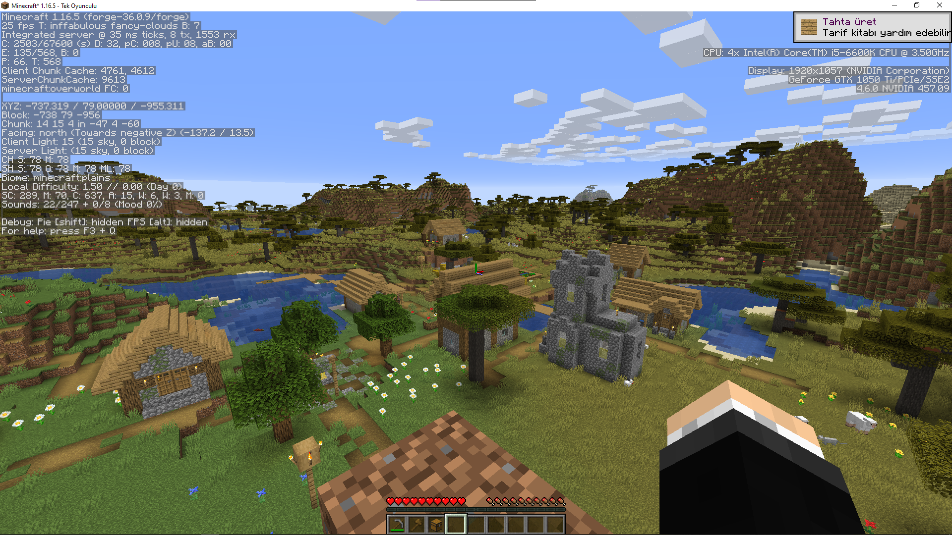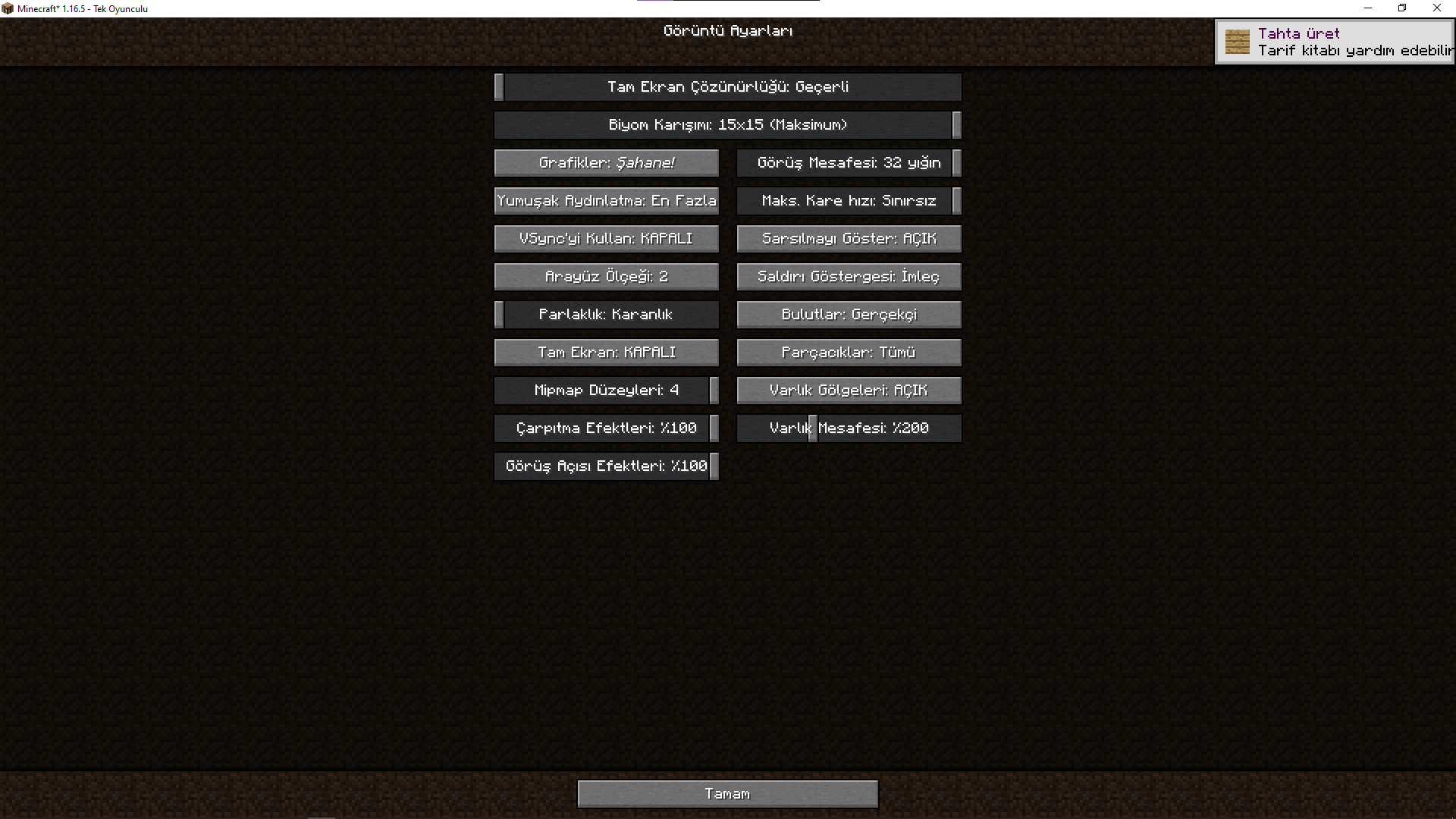 Tüm bu ayarlara rağmen Windows 10 sürümü sabit 60FPS, Java sürümü en en en uzak mesafe çizimlerde dahi 28 FPS altına düşmüyor. Yüzey seviyesinde köye bakarken veya sağda solda koştururken çok rahat 60 FPS üstü alıyorum. Tüm bu değerler "Vanilla" 1.16.5 sürümü için geçerli. Sisteminde ekran kartı kaynaklı bir sorun yok yani.