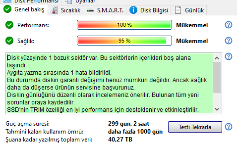 "Disk yüzeyinde 1 bozuk sektör var. Bu sektörlerin içerikleri boş alana taşındı.