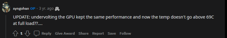 Ekran kartını undervolt yapmasına rağmen undervoltsuz haliyle aynı performansı aldığını ve tam yükte 69 dereceyi geçmediğini söylemiş.