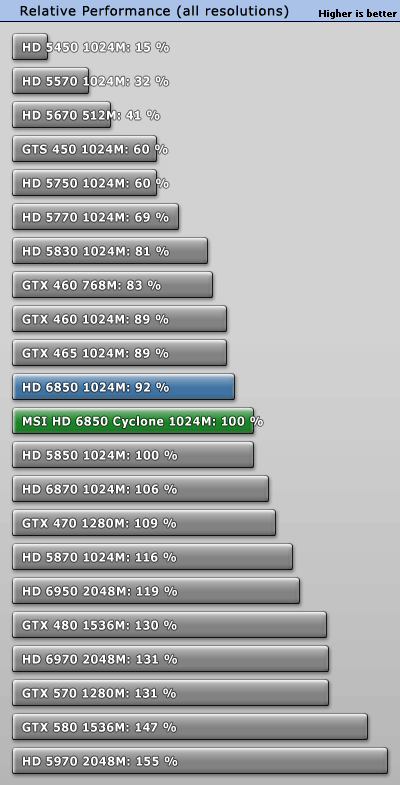 HD 6850, GTX 460'ın 256 bit olanından bile %3 civarı daha iyidir. Overclocklu modellerinden birini alırsanız fark %11'e çıkacaktır.