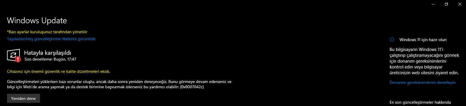 FACEIT oynuyorum FACEIT AC için güncelleme yapmam lazım ama ReviOS kullanıyorum ve Windows Update yaparken "cihazınız için önemli güvenlik ve kalite düzeltmeleri eksik. - güncelleştirmeleri yüklerken bazı sorunlar oluştu, ancak daha sonra yeniden deneyeceğiz. Bunu görmeye devam ederseniz ve bilgi için Web'de arama yapmak ya da destek birimine başvurmak isterseniz bu yardımcı olabilir: (0x8007042C)-" ayrıca format atmayı denedim ama BIOS'a giremiyorum bilgisayar açılırken delete tuşuna bastığımda ekranım siyah kalıyor monitörüme ekran gelmiyor direkt Windows ekranı geliyor ve PC açılıyor.
