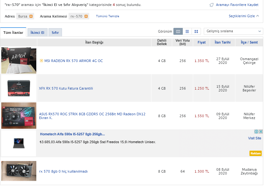 Bazen keşke herkes İstanbul'da 2.el alış-veriş yapabilse diyorum. 2.el piyasasında neredeyse her model mevcut. RX 570'den örnek vereyim. 600tl gibi bir fiyata da bulabiliyorsun. 1300TL gibi bir fiyata da bulabiliyorsun. Temiz Miningsiz kartları 700-800TL'den alabiliyorsun.