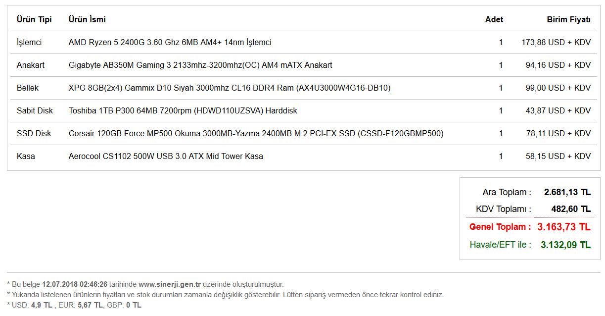 Bütçe sebebi ve oyun ihtiyacınız olmadığı için ekran kartı eklenmedi, Ryzen 2200g' nin dahili ekran kartı yetecektir. Günlük işlerden kastınıza bağlı olarak, İntel kanadından daha uygun fiyatlı sistem toplayan arkadaşlar olacaktır.