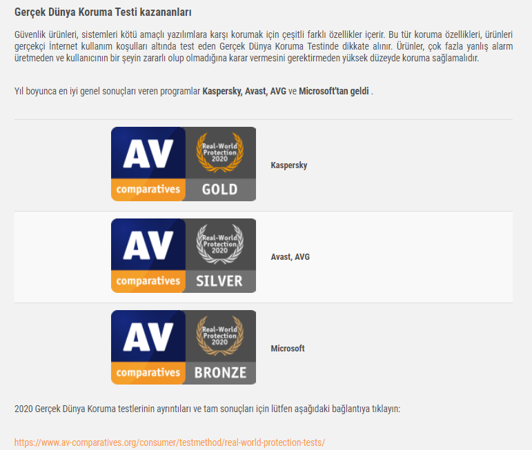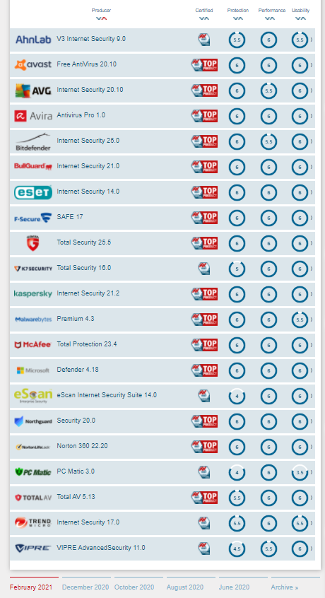 Sitesinde Şubat 2021 için belirli şartlarda testler gerçekleştirmiş, Sonuçlara buradan göz atabilirsiniz 6 olanlar tam puan alanlar. Bu derecelendirmede dikkat edeceğiniz durum, uygulamanın sürüm versiyonu. Eski versiyonda kötü olan bir antivirüs yeni versiyonda çok iyi şeyler yapabilir.
