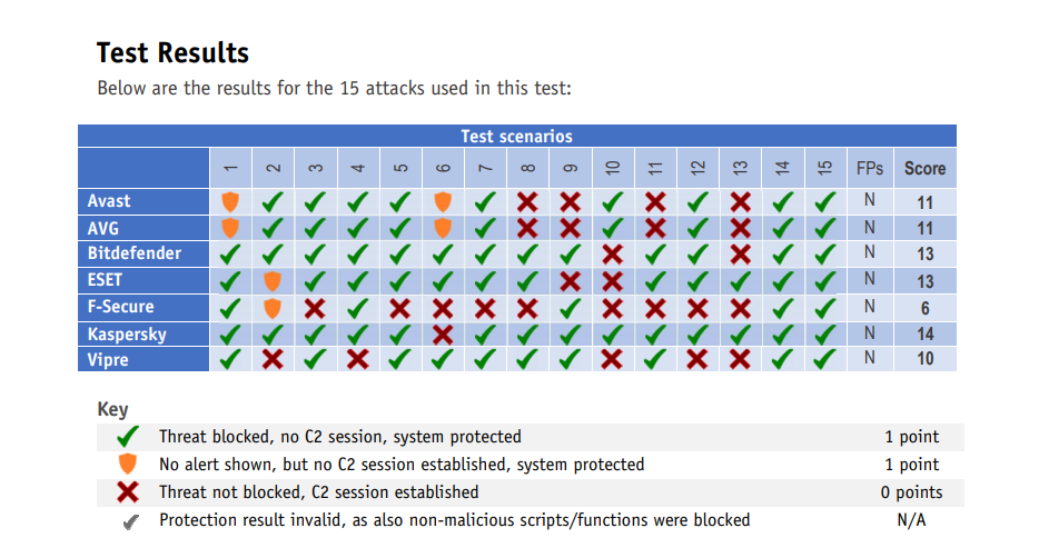 15 senaryo üzerinde programların durumu. En başarılı programlar Kaspersky, Bitdefender ve ESET oluyor.