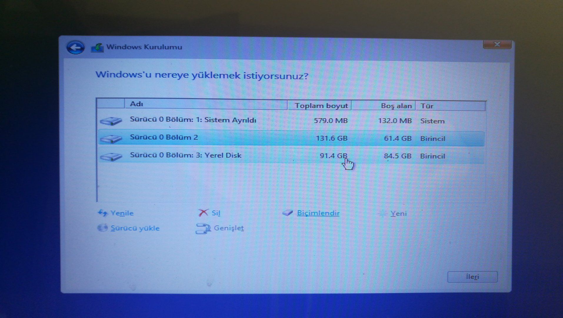 Sürücü 0 bölüm 2'yi biçimlendir Windows'u yükle.