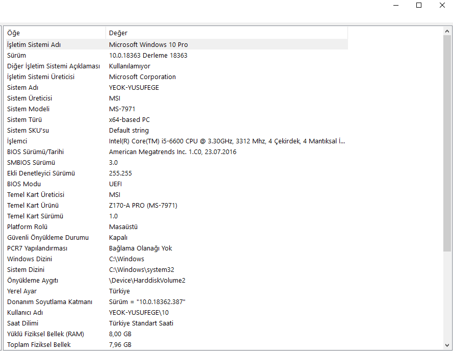 - Ağ: İstanbul Ethernet IP Düzey / CPU: i5-6600 @3.30 GHz / Monitör : HP L1908w 1440x900px / Disk: Sata 120 GB SSD / Mic : Snopy SN-140M / Hoparlör: Genel Hoparlör / GPU: Nvidia GT 730 4GB Anakart: Msi-Z170 A Pro