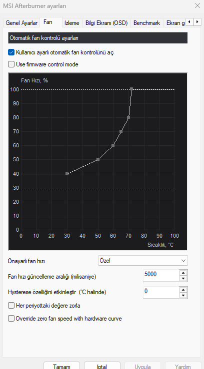 Bak ben hardcore oyun modu için böyle bir fan profili ayarladım yaz ayını da hesaba kattım tabii. Fan sesi falan pek duymuyorum kasadan çünkü sıvı sogutmanın fanı sanırım bastırıyor. Sıvı soğutma da sessiz diye bilinen Arctic Freezer III Pro bir de.