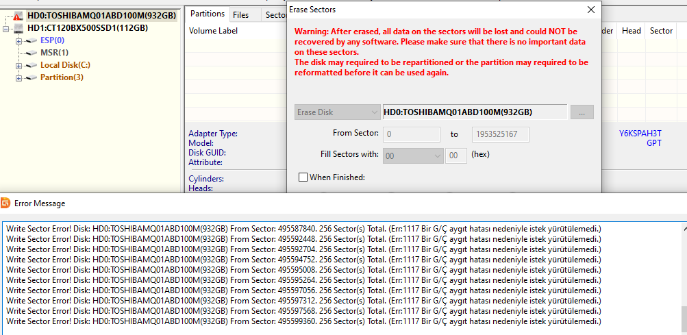 Başlıkta da belirttigim gibi hard diskimi bölümlere ayırıp Linux, Windows vs kuruyordum fakat Linux'da bolumleme yaparken birden bozuldu. Hiç fiziksel hasar falan almadı sadece yazılımsal olarak bozuldu ama duzeltemedim. Ekran goruntulerini bırakıyorum. Onerdiginiz yontemleri deneyebilirim. (toshıbaMQ01ABD100M 1TB laptop HDD) içindeki veriler onemli degil.