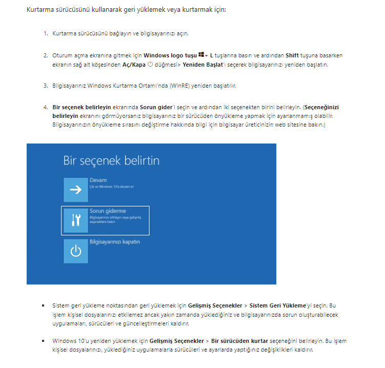 Not: Kurtarma sürücüsü ile kurulum nasıl yapıldığını öğrenmek için linke tıkladıktan sonra aşağı kaydırarak "bilgisayarınızı geri yüklemek veya kurtarmak için kurtarma sürücüsü kullanma"'ya tıklayın orada adım adım anlatmaktadır.