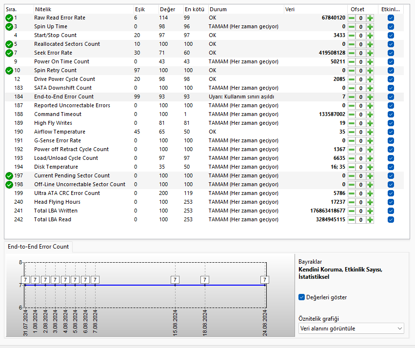 End to end hatasını pek gördüğümü hatırlamıyorum. Emin olamadığım tek nokta bu. Diske yazılan veri ile kaynak arasındaki tutarsızlığı gösteriyor diye biliyorum. Yani yazılırken veya yazıldıktan sonra bozulmuş veri tespiti yapılmış. Bu da henüz 7 defa karşılaşılmış.