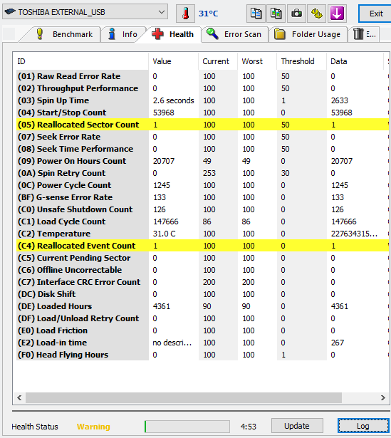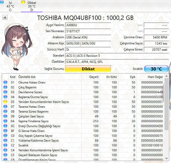 Arkadaşlar 2 adet disk test uygulamasında test yaptım, ikisinde de "warning" uyarısı alıyorum. Hardiskin durumu nedir? Yardımcı olur musunuz teşekkürler.