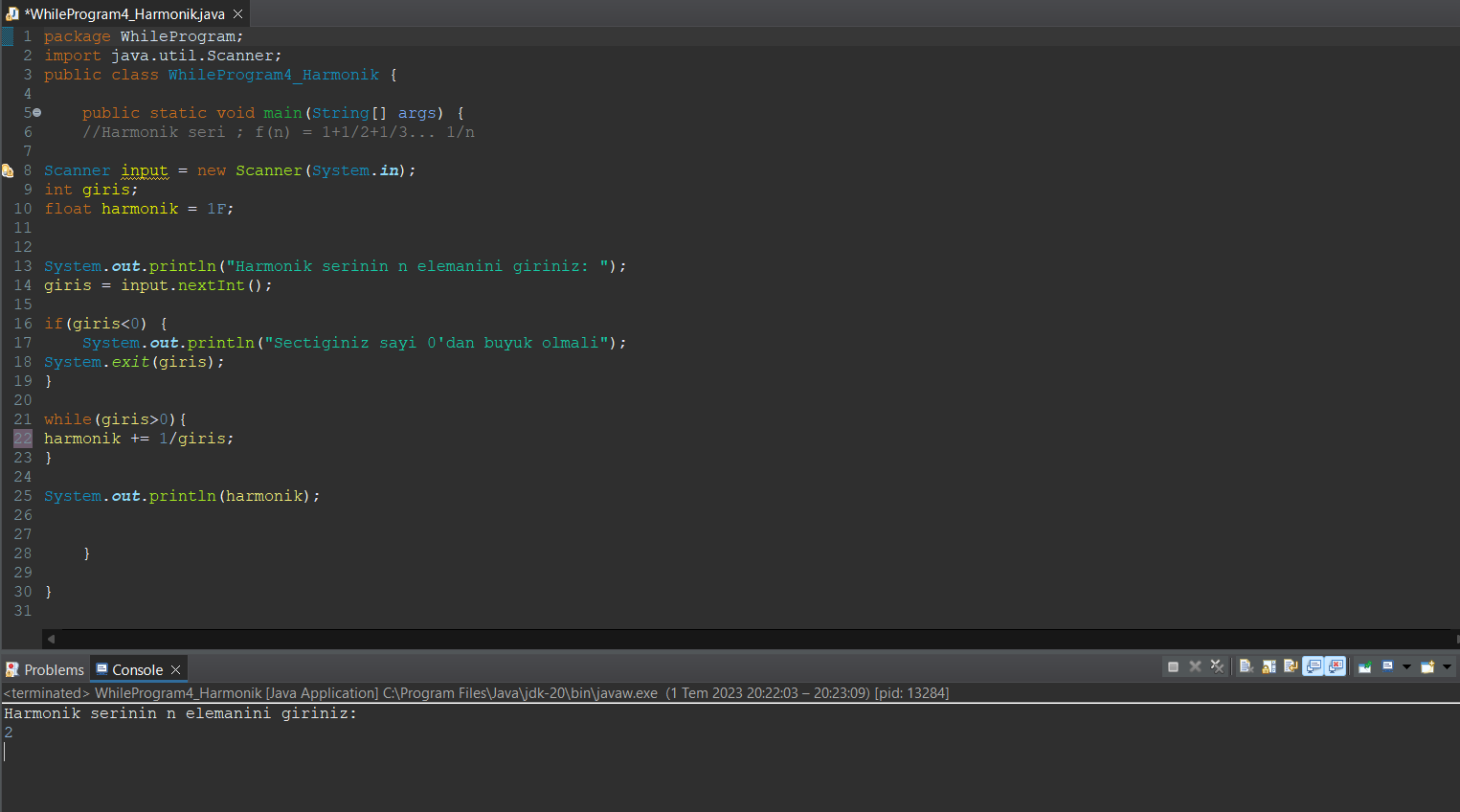 Seçtiğim sayıya kadar 1+1/2+1/3 şeklinde toplanmasını istiyorum. 19. satıra kadar gayet normal çalışıyor. Negatif sayı verdiğimde uygulama kendini kapatıyor. While kısmında ise bir sorun göremedim ama Syso'nun içine ne yazarsam yazayım herhangi bir sonuç yazdırmıyor ekrana sorun nedir?