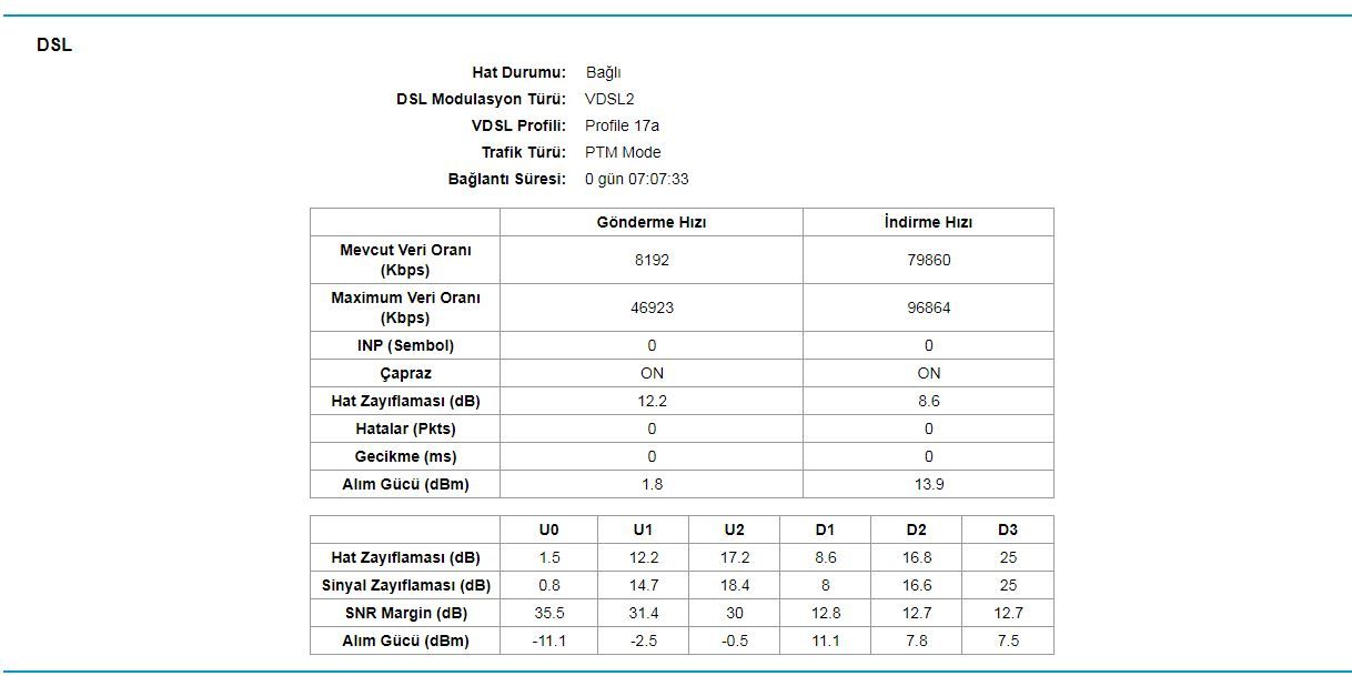 Hocam bu paylaştığınız ekranda ki "noise margin" ve "attenuation" değerleri benim arayüzde hangi değerler oluyor. DB cinsinden 3 farklı değer var benim modem arayüzünde.