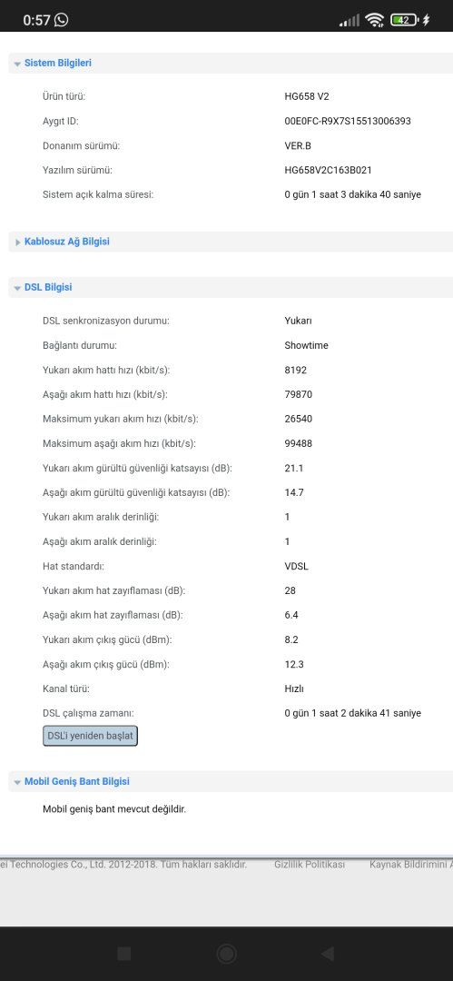 Merhaba herkese. Yeni eve taşındım müstakil bir ev internet direkten üst kata geliyor orada bir ekle aşağı kata benim evime içeriden bir ekle modeme bağlanıyor. Hat değerlerimde sıkıntı olduğunu düşünüyorum. Paketim kaldırmıyor olabilir, üst kattan gelen kablomda sıkıntı olabilir sıfırdan CAT 6 çekmeyi düşünüyorum ama yine de mecburen 1 ek olacak yukarı bağlantı yerinde. Hat değerlerini attığım modem HG658 V2 pek kopma yaşanmıyor ama stabil değil yine de. ASUS AC51 modemimdede sürekli kopma oluyor.
