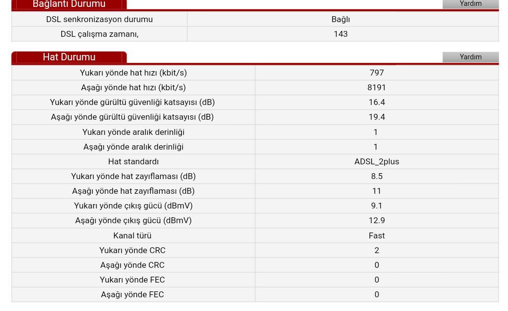 Hat değerleri sayfasında yenileyip hat zayıflaması değerleri ve Mbps değerleri değişmediğini ve SNR margin değerleri her yeniledigimde çok farklar artıyor. Birden 10'dan 3.5'e düşüyor gibi. Fec ve CRC hataları bayağı fazla. Sorunun kablo olduğu düşünüyorum Port'a bağlama kısmında. Hat değerlerim bu şekilde: