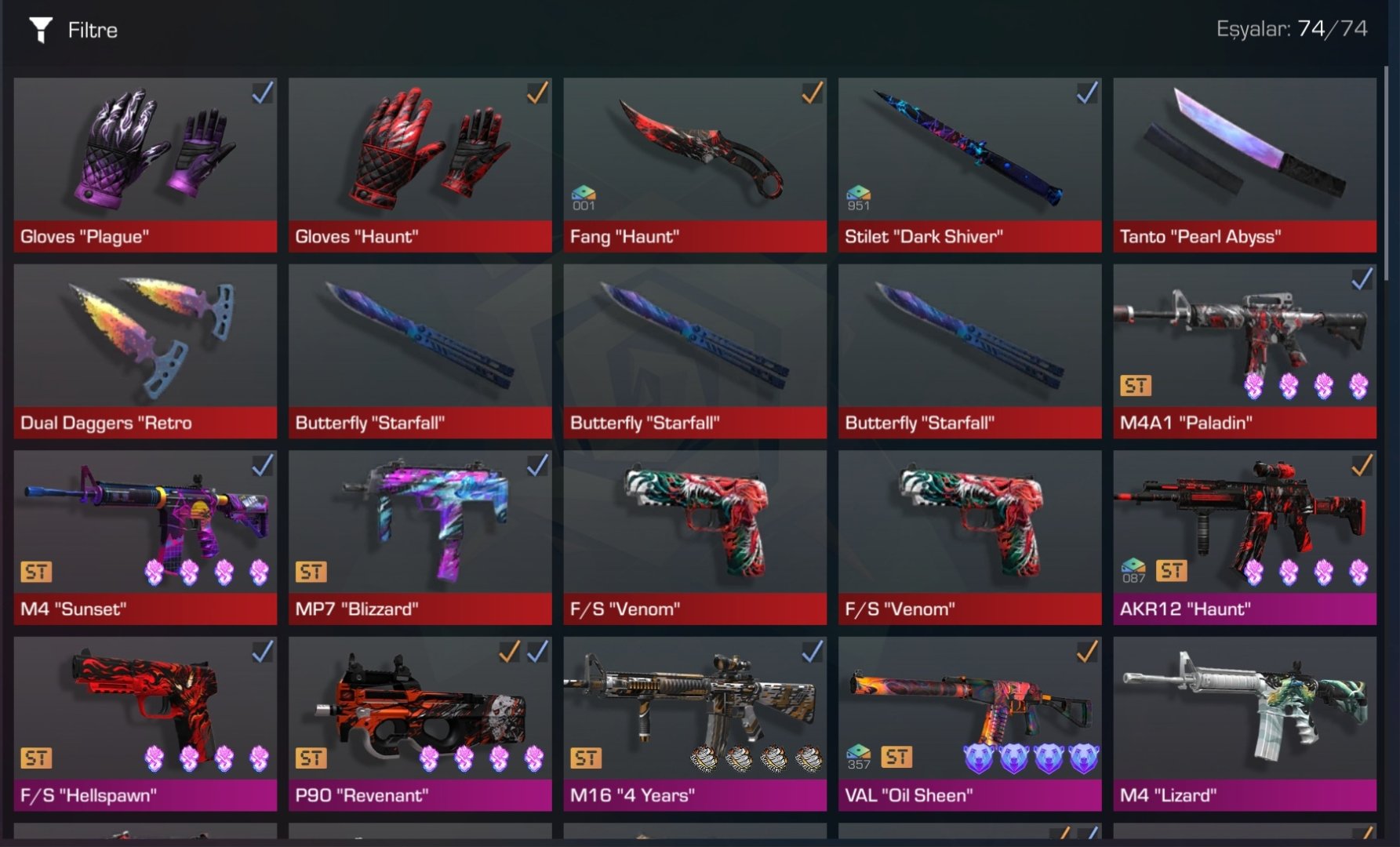 Hesap biraz pahaliya kacar ciddi ciddi. 4 sezondur master hesap. 2 eldiven 4 bicak (birinin patterni 01 yani baya nadir)var. Kullandigim itemlerin hepsi stat track. Baya bi arcane ve sezon itemi de var. Stickerlere girmiyorum.