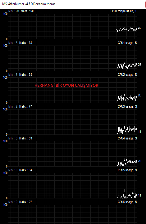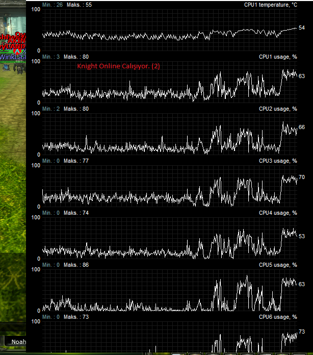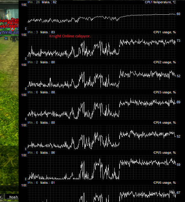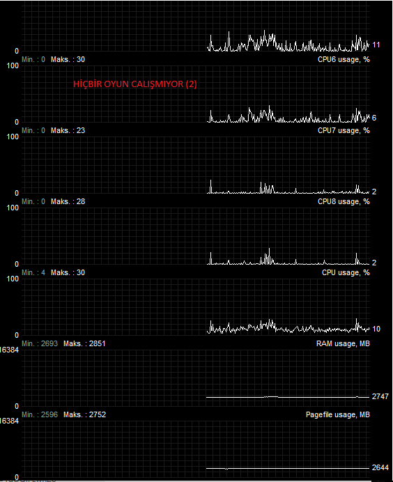 Öncelikle özür dilerim,kurallara uymadığım için 2 gün uzaklaştırıldım bu nedenle sorunuza cevap veremedim.Dediğiniz programı indirdim yapmaya çalıştım,fotografını atmamı istediginiz değerlerin,fotografını yükleyemiyorum,boyutu fazla olduğu için ama gözlemlediğim kadarıyla oyunu açmadan cpu kullanımı %20 25 ilk oyun açıldığı zaman(knight online) %80 e yükseliyor sonra %50 60 arası kalıyor ama RAM çizgisi hiç hareket etmiyor yükselmiyor hep sabit sanırım oyuna girdiğimde RAM’i kullanmıyor.