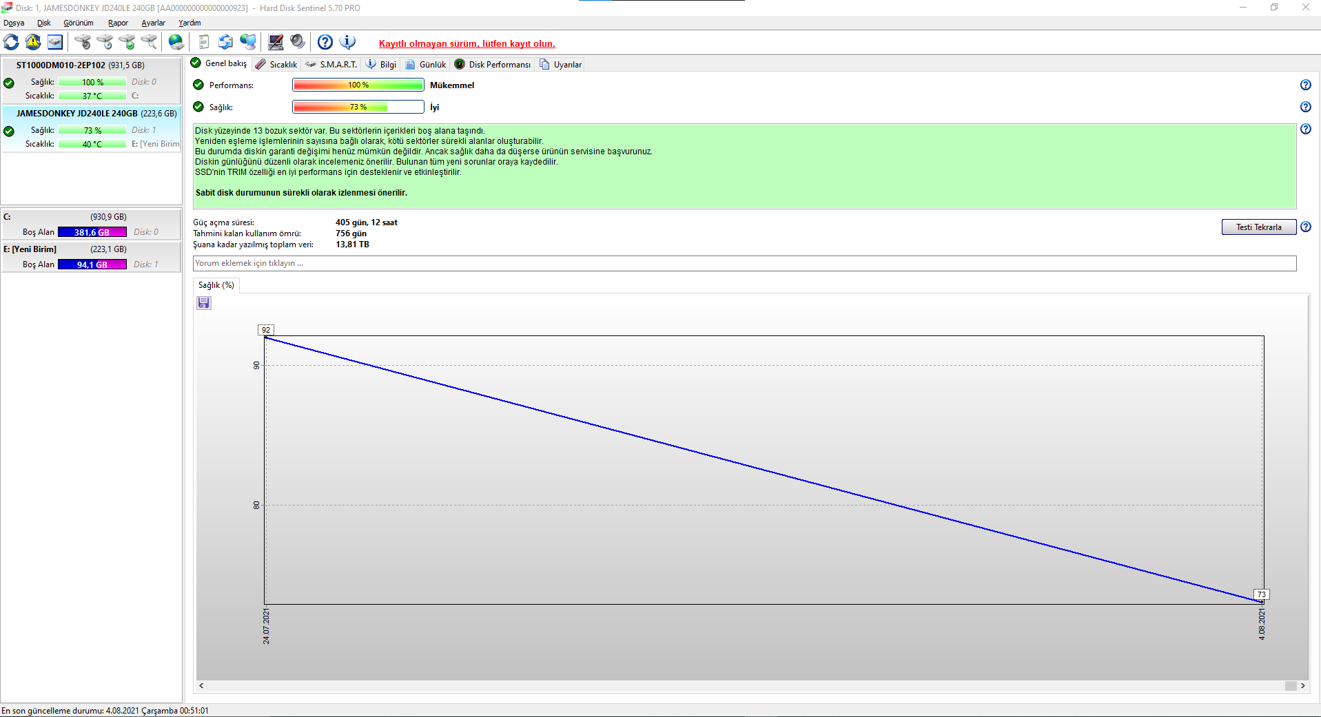 HD Tune sağlık testi yaptım ve SSD sağlığım %88'den %73'e düştü.