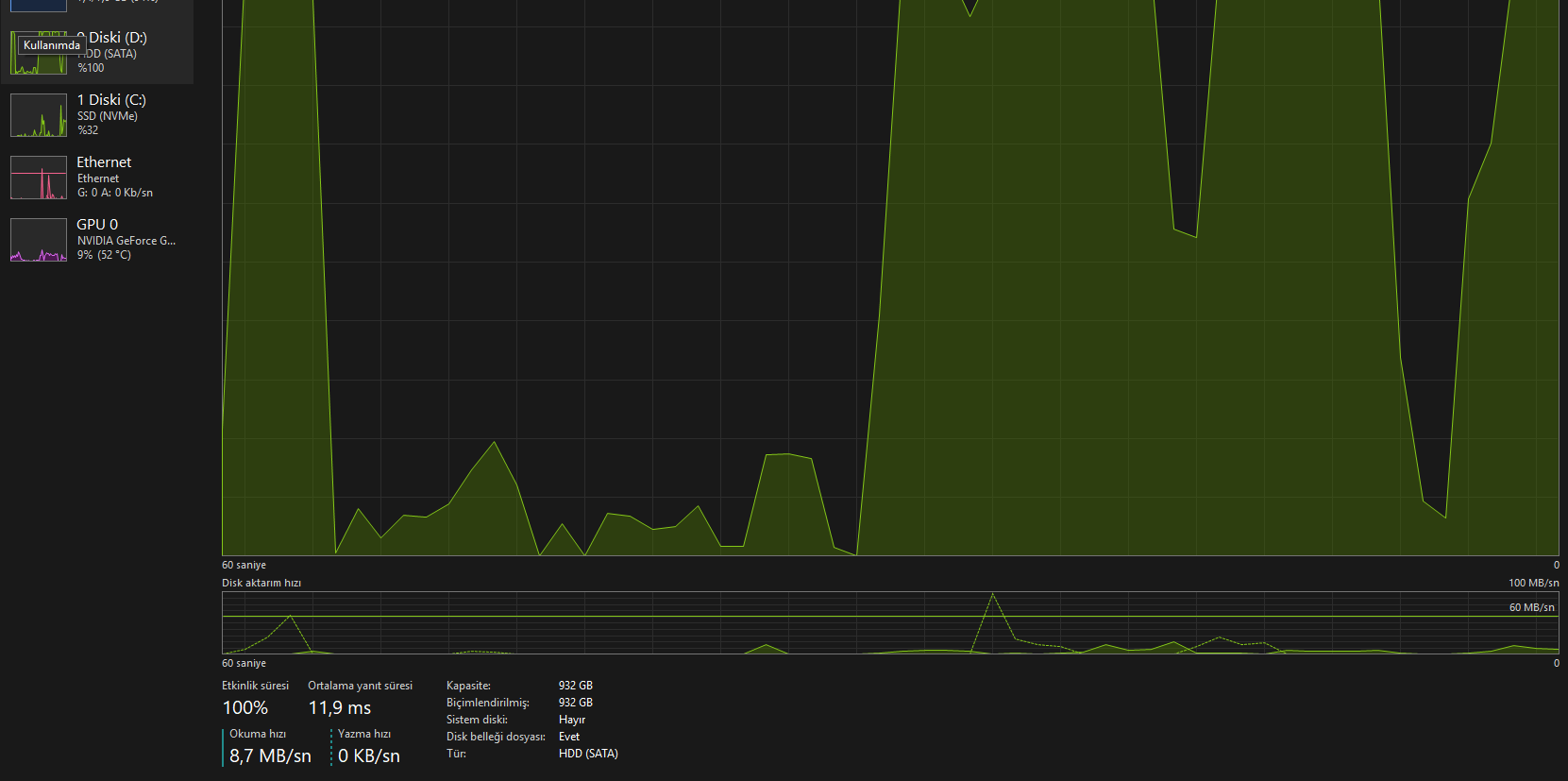 Bilgisayarda 2 tane disk var. 1 tanesi HDD, diğeride M.2 SSD. PC'deki her şey M.2 SSD'ye kurulu, sadece Google'dan indirdiğim şeyler HDD'ye iniyor. HDD kendi kendine %100'e çıkıyor, iniyor ve değişiyor. Sebebi ne olabilir?
