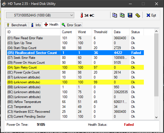HDD'nizin arızalanması yakındır. Reallocated sector count diskin ölmeye çok yakın olduğunu gösteriyor. Çok benzer bir durumda aynı marka HDD var bende, yüklediğim şeyler çok geç açılıyor ya da aniden donuyor. HDD'yi kullanmaya devam etmek istiyorsanız tavsiyem seatools indirip diskinize "fix all long" işlemini yapmanız. Benim 1 TB diskimde 3 saat sürdü, sizde 5-6 saat sürebilir. Fix all long yaptıktan sonra diski biçimlendirir veya format atarsanız yaptığı işlemler boşa gider, bir daha yapmanız gerekir unutmayın.