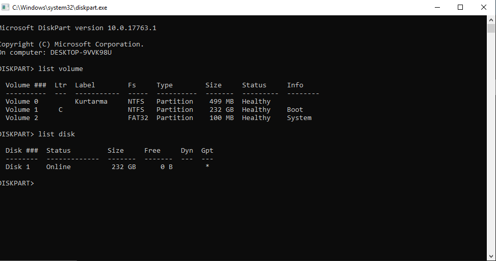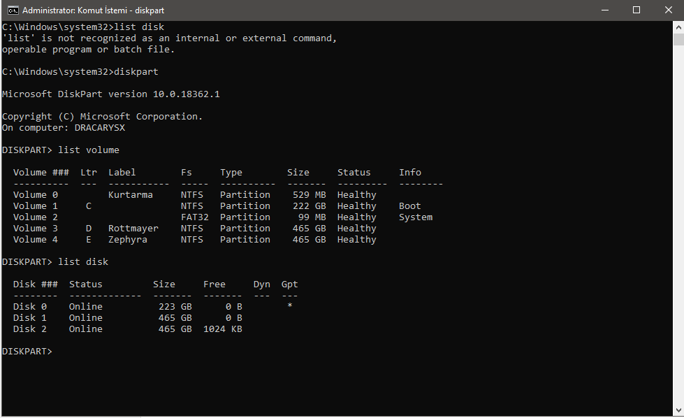 Diskpart'ta List Volume yerine list disk yazın.