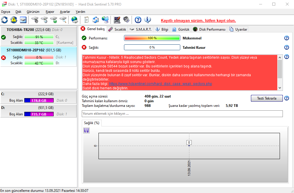 Şu anda kullanmış olduğum HDD'din değerleri yukarıda gördüğünüz gibi. Kaspersky HDD durumun kötü demesi haberim olmayacak. Kaspersky'da sağlığı %0 gösteriyor. Sağlığının kötü olduğunu öğrenene kadar bilgisayarı kullanırken pek sorun yaşamadım. Ama son 1 haftadır oyun oynarken Alt Tab yaptığımda ekran kilitleniyor, mouse imleci dona dona hareket ediyor vs Başka uygulamalarda da yaşıyorum. Bu durumun HDD'nin şu an bulunduğu durumla bir ilgisi var mıdır? Ayrıca Reallocated Sector Count 2700 falan görenlere arkadaşlar hep ölmüş HDD değiştir vs demişler. Bu durumda 58544 çıkan benim HDD ne oluyor? Kullanmaya devam etsem HDD harici bilgisayarın başka parçalarına zararı olur mu? Yoksa en kısa sürede değiştirmem hatta değiştirene kadar HDD'yi sökmem mi gerekir? Bilgilendirirseniz çok memnun olurum. 'Bu arada HDD'yi alalı daha 2 yıl ya oldu ya olmadı. Kasa içinden baktığımda fiziksel herhangi bir zarar göremedim.)