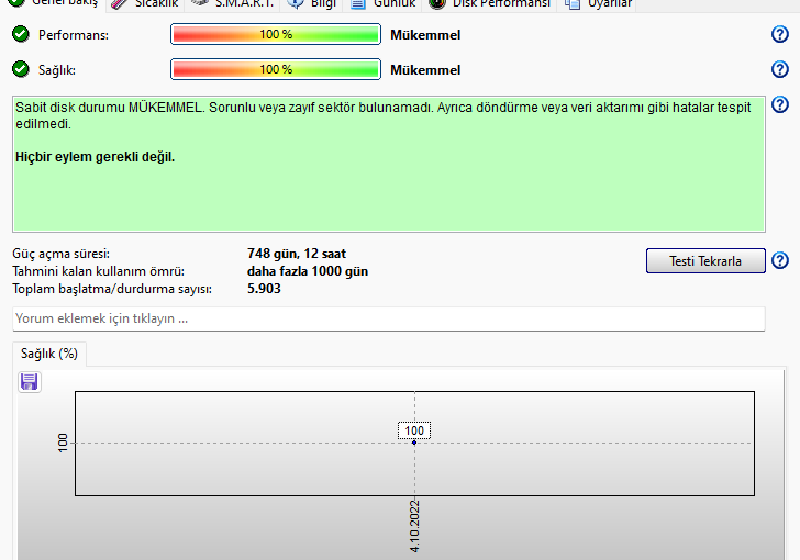 Merhaba, aynı durumu yaşıyorum. Benim de sağlık %52 performans %100. harddiskinizin akıbeti ne oldu ne kadar kullanabildiniz acaba?