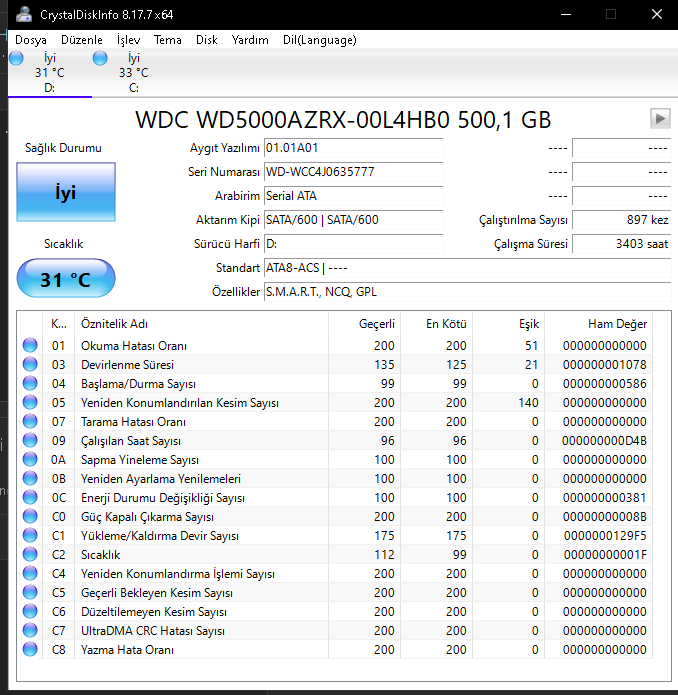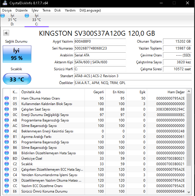 Kingston kolay kolay yolda bırakmaz normal şartlar altında 3-5 yıl daha gider diye düşünüyorum. HDD için bir de HDD Sentinel ile bakın. %1 değerinde sağlık ya da performans kaybı görünse bile sorun olabilir. Değerlerin %100 olması gerekiyor.