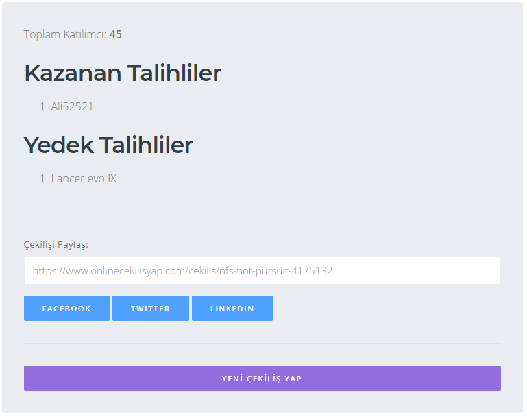 Çekiliş sonucu linki - kazanan DC bıraksın.