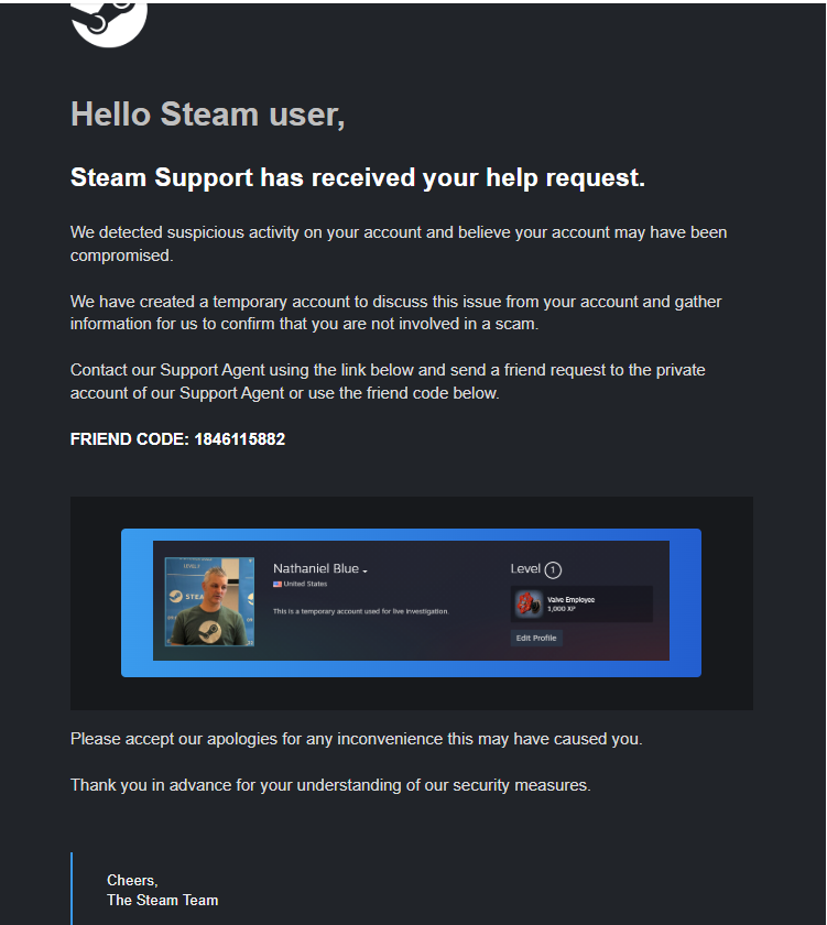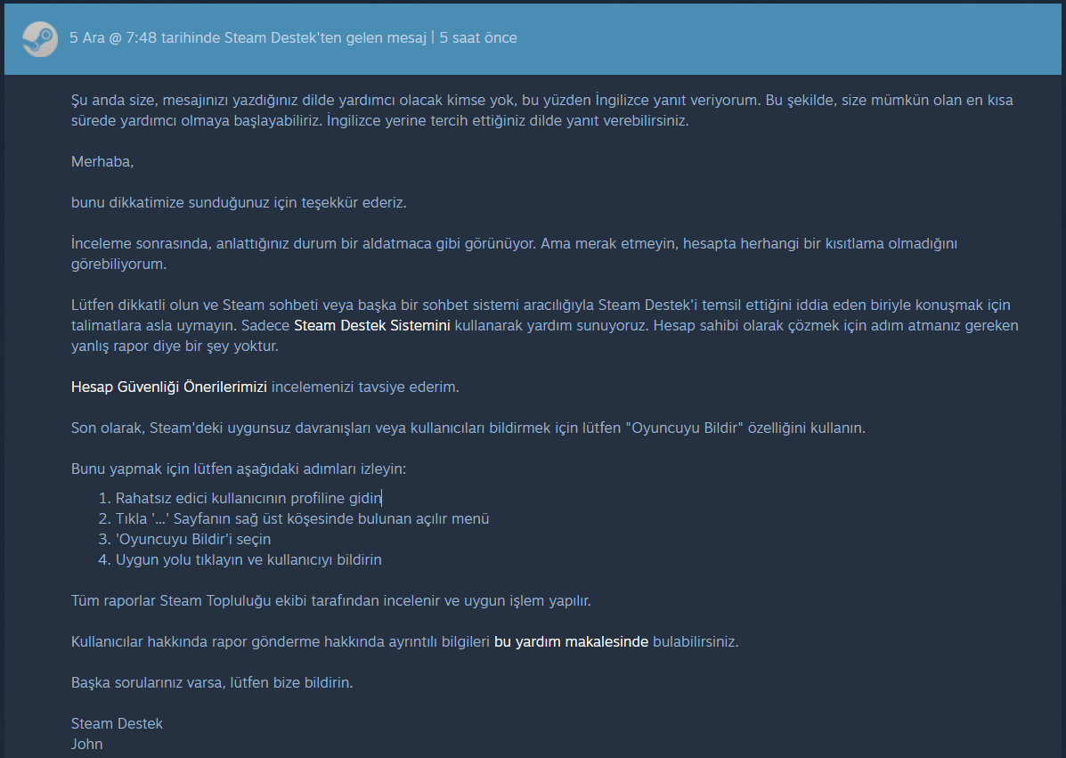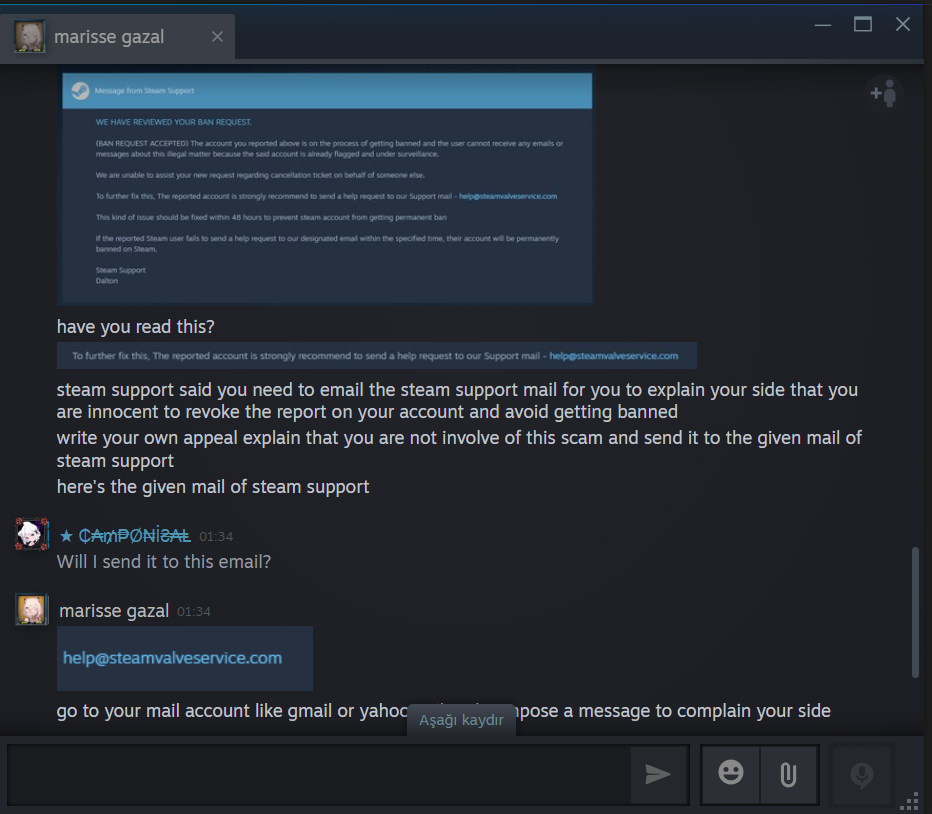 Bana Steam özelden mesaj yazdılar. Rust oyunundan bir eşya satın almış sözde ama bende Rust oyunu diye bir şey yok. Desteğe yazmış ve destek 48 saat içinde perma banlayacaklarını dile getirmişler. Sizce gerçek mi?
